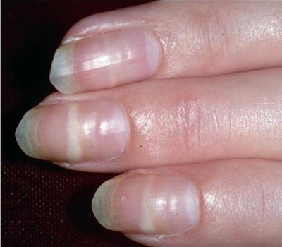 Aldrich Mee’s Lines – Discolored lines running across the nails. Indicates arsenic poisoning or poisoning from other heavy, toxic material.