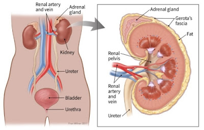 Small glands called adrenal glands sit above each of the kidneys. Each kidney and adrenal gland is surrounded by fat and a thin, fibrous layer known as Gerota’s fascia.